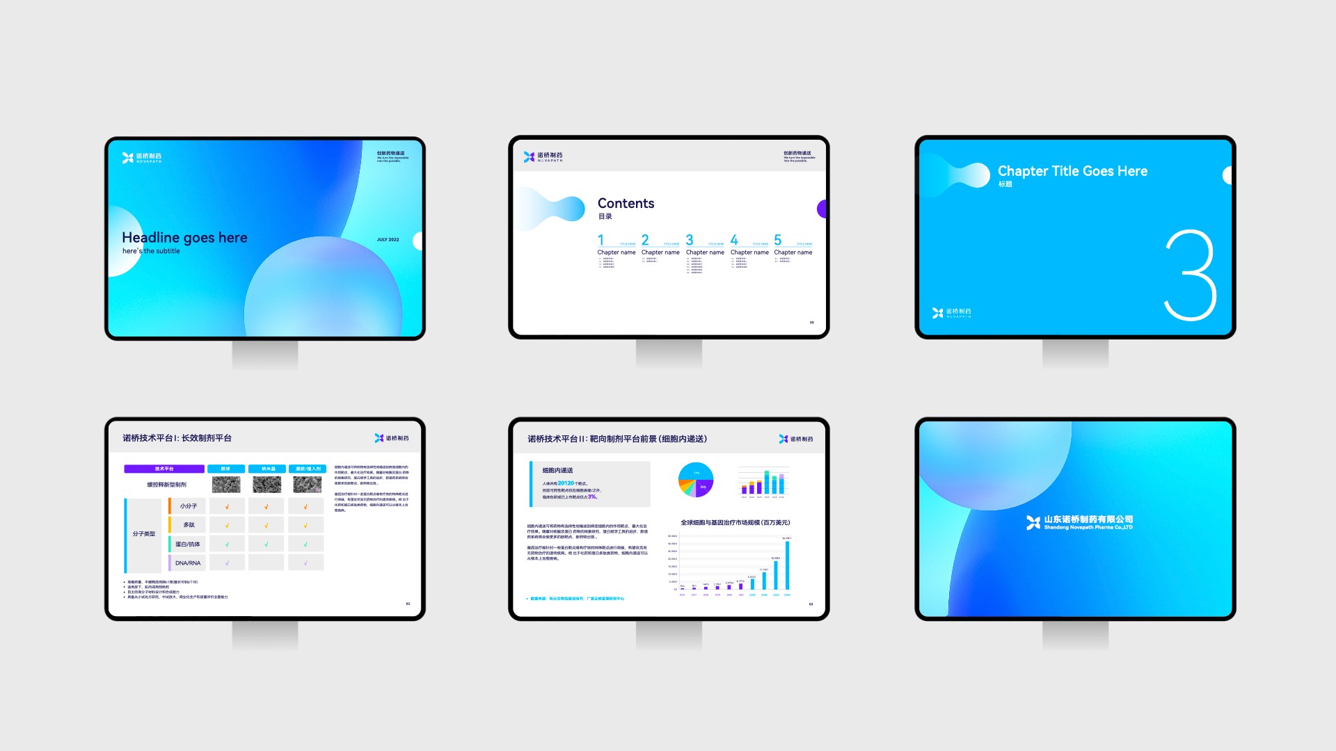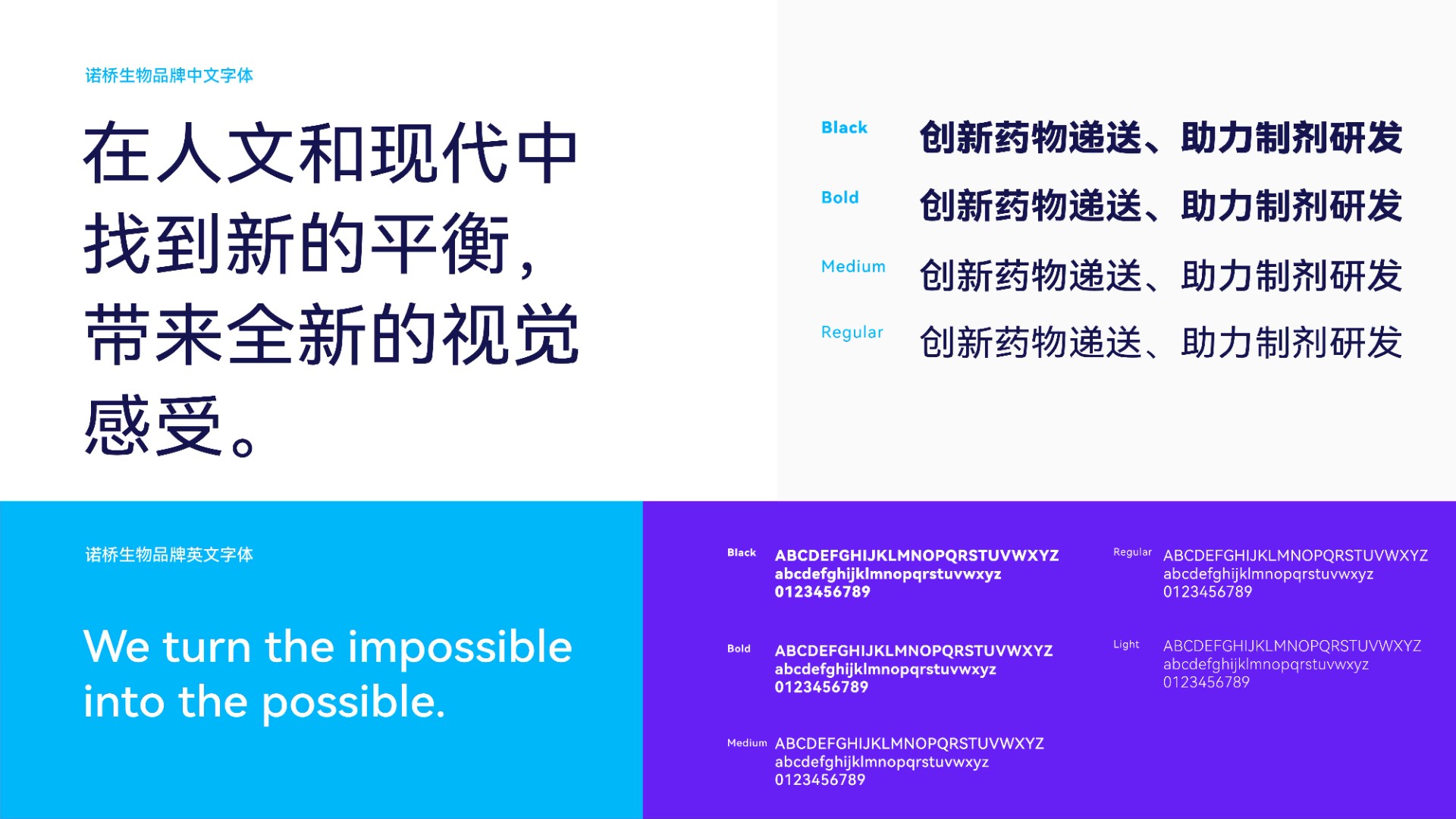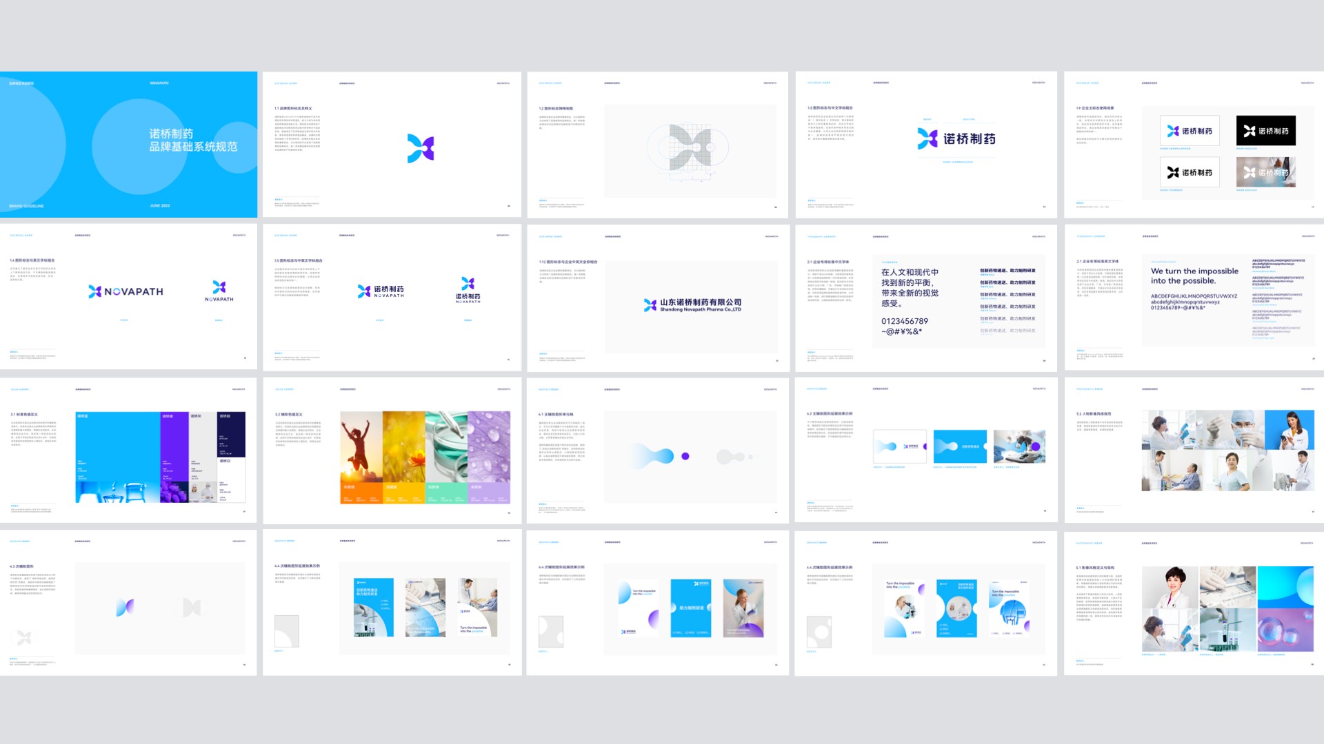 在品牌視覺系統(tǒng)的其他要素建設(shè)中,于色彩部分,我們使用了更明亮的藍(lán)色凸顯諾橋制藥的創(chuàng)新科研專業(yè)能力。又從諾橋藍(lán)中衍生出一個藍(lán)紫色,正所謂“青出于藍(lán)而勝于藍(lán)”,這組品牌主色明快、純粹,演繹了諾橋在不斷追求技術(shù)卓越創(chuàng)新中的探索精神。塑造了諾橋的色彩情緒識別,于圖形部分,我們結(jié)合了藥物遞送中最有價值的現(xiàn)象,通過對藥物的高效靶向遞送解決藥物研發(fā)及病癥難關(guān)的“最后一公里”,通過平面手法呼應(yīng)藥物分子生物輪廓的圓形,延續(xù)圖形標(biāo)志中的從左至右的穿透狀態(tài),將從虛到實、從散到聚的狀態(tài)發(fā)揮至諾橋品牌的主輔助圖形中,形成獨具個性的諾橋制藥圖形語言,有效反應(yīng)了諾橋制藥的核心技術(shù)價值,在整體元素的有機結(jié)合之下,諾橋制藥通過視覺形象揉捏了技術(shù)價值與文化價值,將技術(shù)表達(dá)理念的想象帶到品牌識別中,形成一個獨特且具備專業(yè)質(zhì)感的品牌印象,有效的幫助了諾橋制藥快速傳達(dá)的需求,更好的幫助該品牌在市場中形成聲量,提升商業(yè)價值。