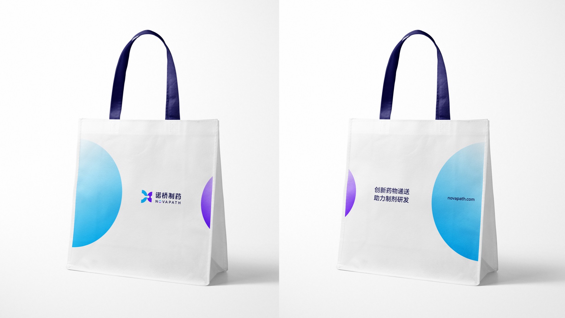 我們在這關(guān)鍵性描述的指導(dǎo)下,為諾橋制藥提出了全新的品牌視覺概念語言:“成功新通道”。根據(jù)這一概念,我們開發(fā)了諾橋制藥品牌的視覺形象。其中,諾橋的圖形標(biāo)志靈感來自于諾橋團隊分享的科研資料中“脂質(zhì)體技術(shù)”在靶向給藥過程中的藥物分子遞送狀態(tài),我們進(jìn)一步對此抽象概念語言進(jìn)行了可視化的具像呈現(xiàn)。用左右兩邊半圓之中的液體流動輪廓表現(xiàn)了在藥物遞送過程中有方向性的、具有穿透感的藥物遞送瞬間。同時此圖形標(biāo)志整體也構(gòu)成了字母“N”的形狀,賦予諾橋制藥(NOVAPATH)更多的品牌專屬性和識別性。