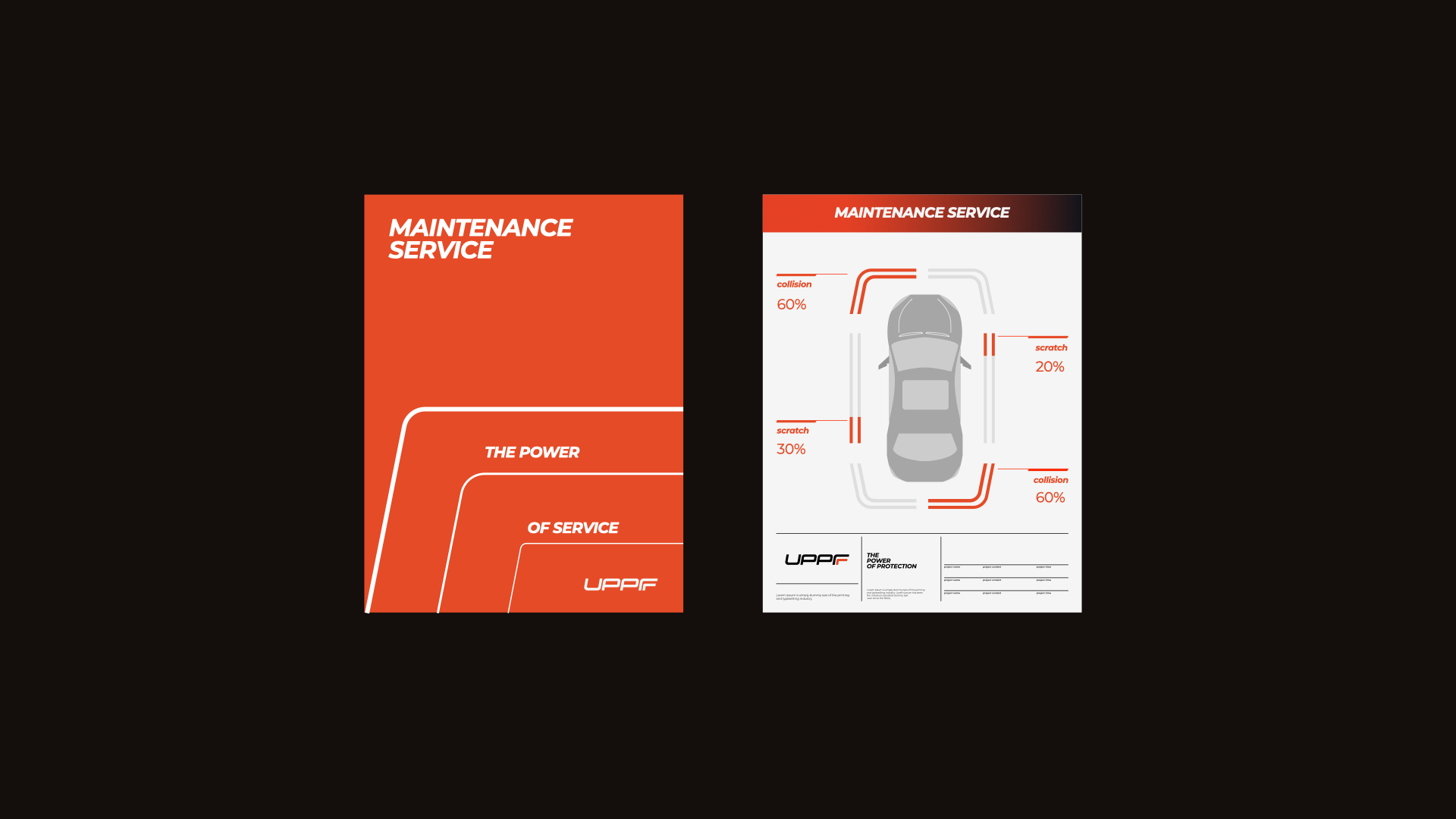 在品牌形象塑造中,煥識延續“THE POWER OF PROTECTION”品牌語詞及定位,建立一個極具張力與個性的品牌形象系統,以幫助UPPF建立有效影響力。因此,全新品牌形象以積極進取、科技、力量感、保護的品牌特質進行設定,在標識調整的傾斜角度上給人以前進感,并以 F 為記憶點進行塑造,在字體結構中以兩層的筆畫代表著UPPF的雙層保護,內層為橙色代表著能量的狀態,也傳達出UPPF以積極心態為客戶帶來最優質的車衣產品的決心。