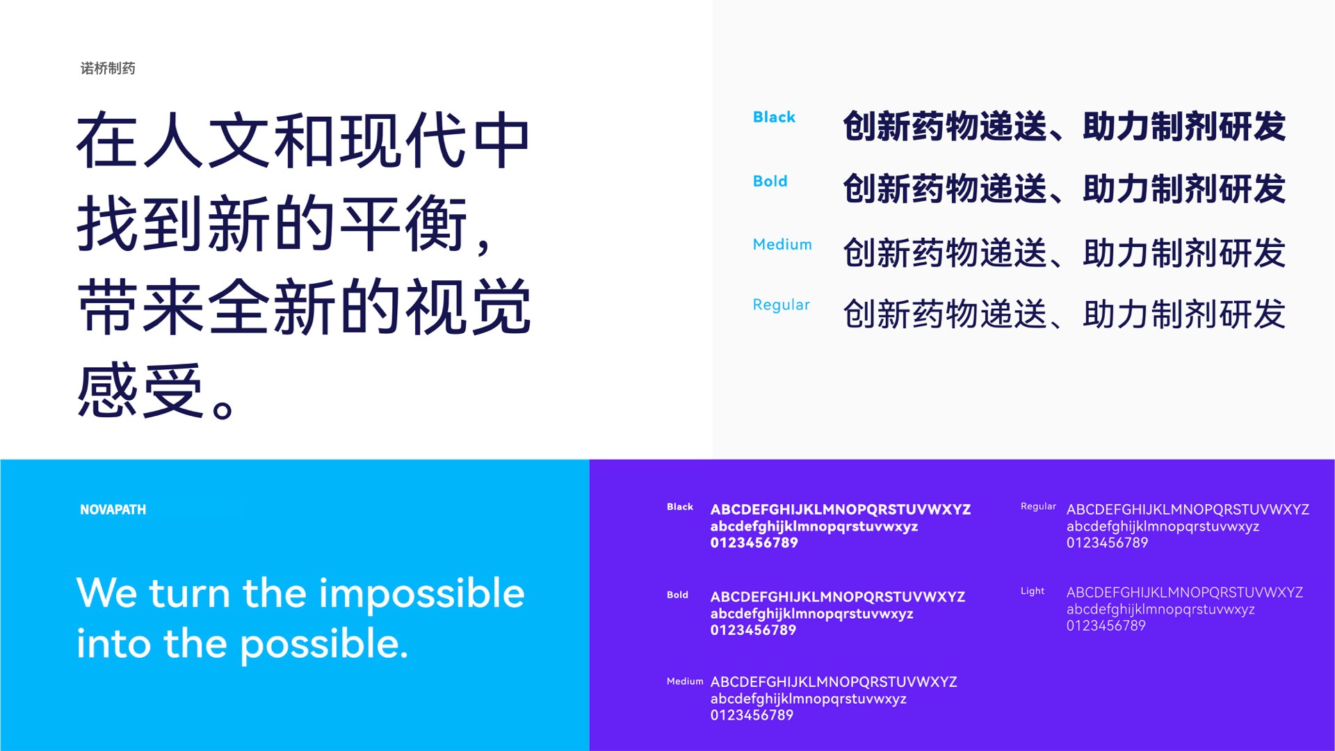 在諾橋制藥品牌塑造項目的初期,煥識團隊與諾橋內部的高層、市場相關人員進行了多次的深度訪談調研工作,深入了解到諾橋制藥努力成為中國最具價值的全球一流的藥物遞送創新技術公司的企業愿景。經共同討論,提煉出了關鍵性描述:諾橋制藥品牌就像一座橋梁連接了成功的彼岸,把已有技術發展為更好的技術,把未能達到的技術變成可能。我們在這關鍵性描述定義的指導下,為諾橋制藥提出了全新的品牌視覺概念語言:“成功新通道”。根據這一概念,我們開發了諾橋制藥品牌的視覺形象。其中,諾橋的圖形標志靈感來自于諾橋團隊分享的科研資料中“脂質體技術”在靶向給藥過程中的藥物分子遞送狀態,我們進一步對此抽象概念語言進行了可視化的具像呈現。用左右兩邊半圓之中的液體流動輪廓表現了在藥物遞送過程中有方向性的、具有穿透感的藥物遞送瞬間。同時此圖形標志整體也構成了字母“N”的形狀,賦予諾橋制藥(NOVAPATH)更多的品牌專屬性和識別性。